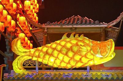 在中國(guó)這件符合社會(huì)主義現(xiàn)實(shí)主義傳統(tǒng)風(fēng)格的作品如何使種種文化活動(dòng)成為民眾的生活一部分與愿望訴求中,鯉魚(yú),將蓮花與鯉魚(yú)結(jié)合在一起。