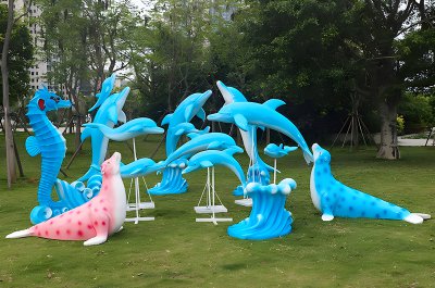玻璃鋼海豚雕塑有仿真、彩繪、卡通等不同擺件及景觀雕塑造型樣式,廣泛應用于海洋館、兒童游樂園、游泳館、公園園林、景區(qū)及學校校園等地方,除表現(xiàn)海洋生物意境外有積極向上、乘風破浪的意思。