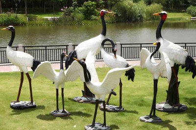 玻璃鋼仙鶴雕塑主要有抽象、仿真、仿銅等不同樣式,常用于園林裝飾及酒店賓館等室內(nèi)美陳。